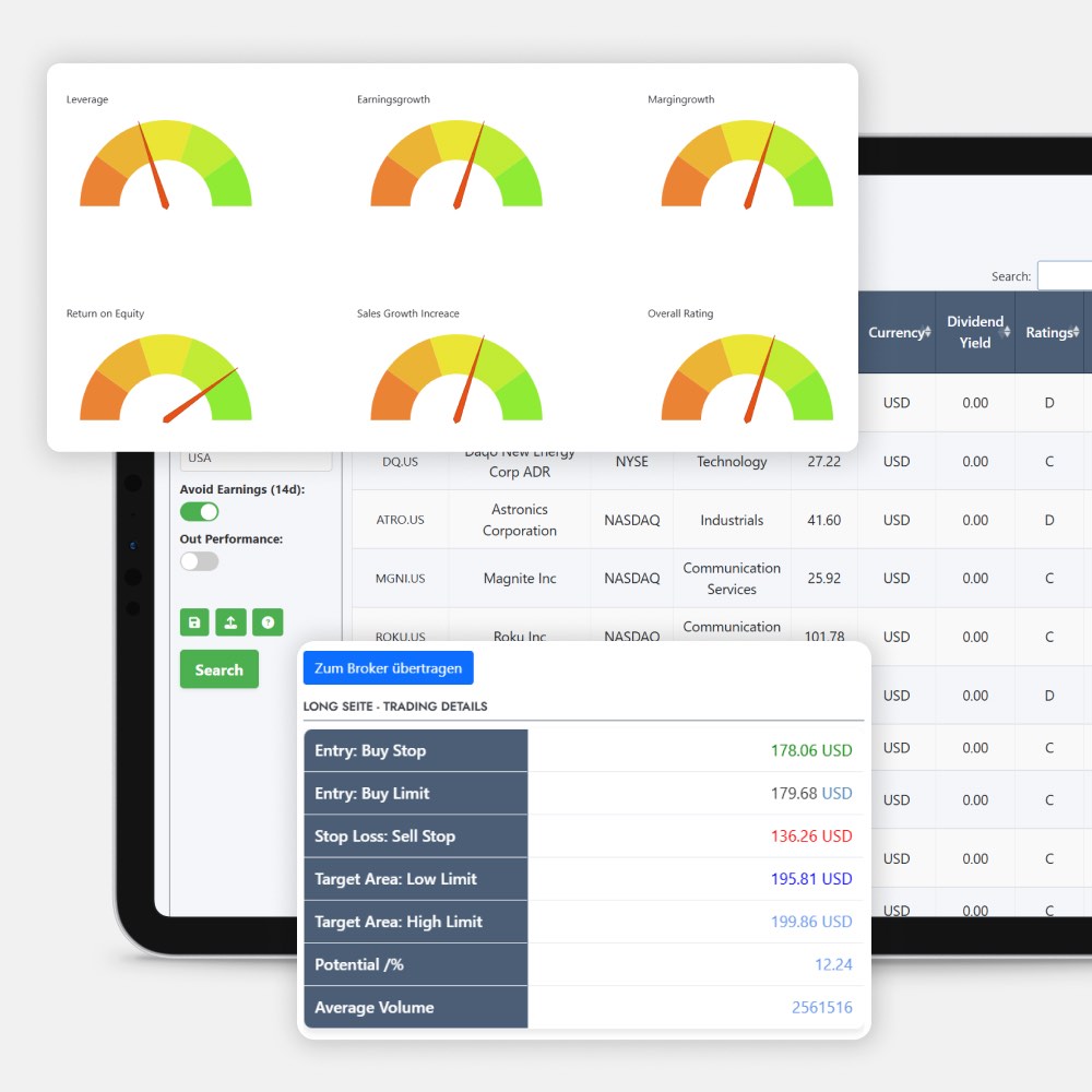 Die Auswertung dauert in der Regel unter 5 Minuten täglich. Die besten Setups sind mit einem Klick abrufbar und direkt handelbar.